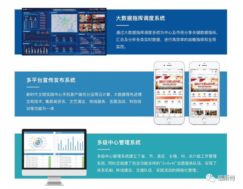 安徽福斯特信息技術有限公司持續(xù)助力新時代文明實踐中心建設,充分利用大數據、云計算、移動互聯網等新一代信息技術,打造新時代文明實踐中心云平臺,完善平臺動員、整合、引導、服務、創(chuàng)新和保障能力,實現新時代文明實踐中心的可持續(xù)運營。 福斯特新時代文明實踐中心云平臺集服務、管理、發(fā)布、展示于一體,推動平臺、終端、和渠道互聯互通,為基層黨的理論宣講、文化建設和為民服務提質增效,為志愿者、受益者與管理者提供了一個安全、快捷、便利、智慧化的新時代文明實踐管理工具 借助“平臺力量”,使現有各級各類資源煥發(fā)活力、配置優(yōu)化、統(tǒng)籌使用、協(xié)同運行,把宣傳教育與引導實踐相結合,搭建與群眾雙向互動的溝通橋梁,增強群眾對文明實踐的理解支持,實現了文明志愿服務動態(tài)交互,充分發(fā)揮文明實踐資源陣地的最大效能。 平臺建設有助于擴大服務范圍,強化服務手段,提高服務效率,實現線上+線下良性互助推動,同步發(fā)展、深度融合,對促進資源綜合利用,提高服務創(chuàng)新能力形成“一呼百應”“應者云集”良好態(tài)勢形成新時代文明實踐中心建設的強大力量。
